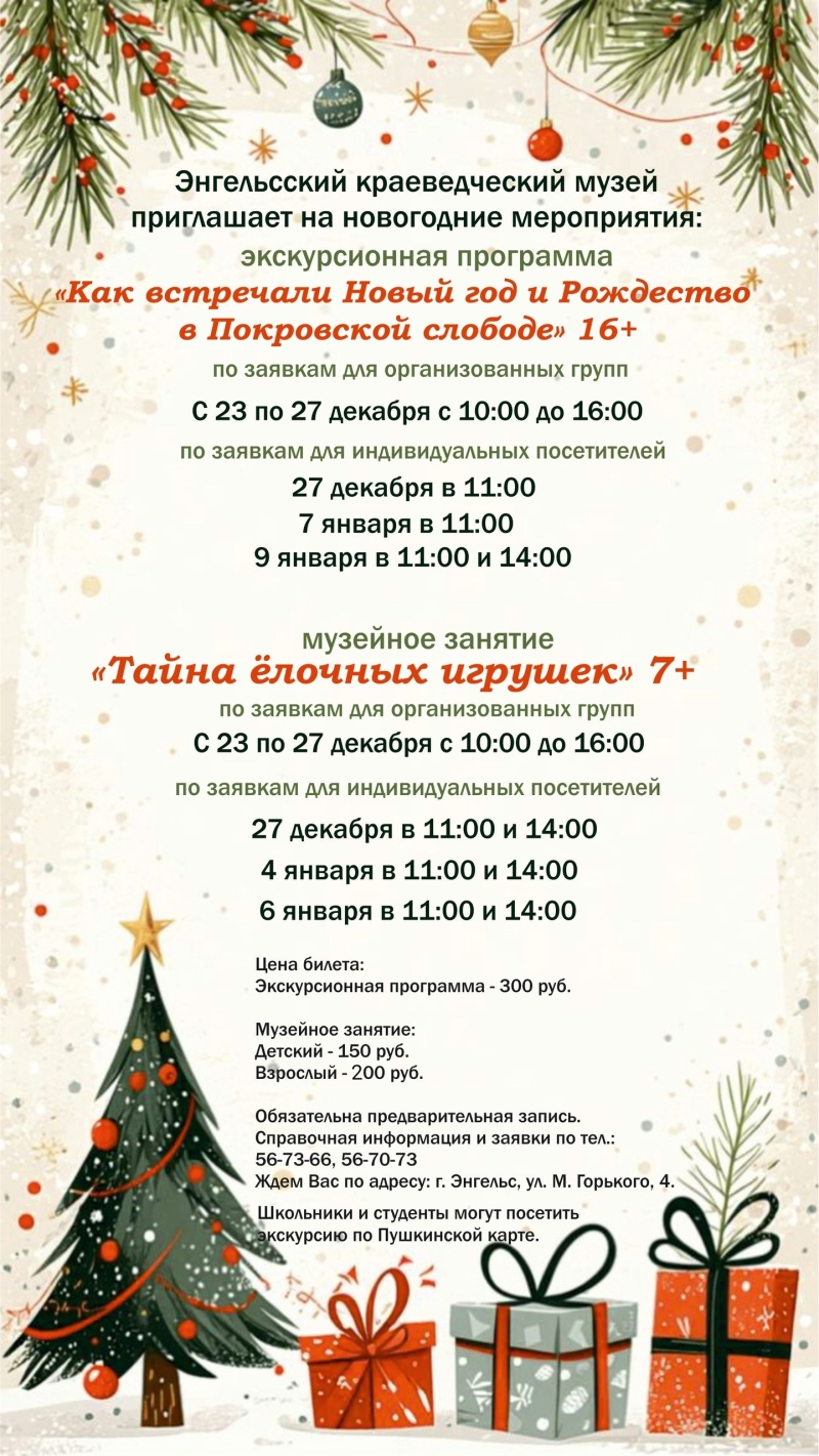 Мы приглашаем вас на новогодние мероприятия, которые будут проходить в Энгельсском краеведческом музее с 23 по 27 декабря 2025 года и в дни новогодних каникул.